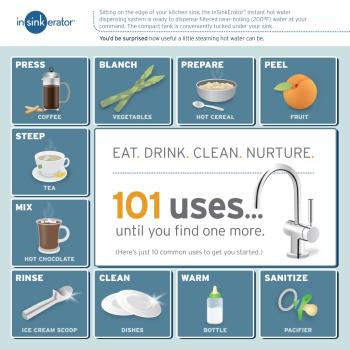 InSinkErator instant hot water dispensers save time and add elegance to the kitchen. Near-boiling water at your fingertips — perfect for making coffee, tea, hot cereal, preparing baby bottles, removing candle wax from holders, quickly cleaning dirty pots and pans, blanching vegetables, removing labels from jars, preparing soup, loosening stubborn lids and cleaning ice cream scoops. 101 ways to use an instant hot water dispenser…that is, until you discover more!